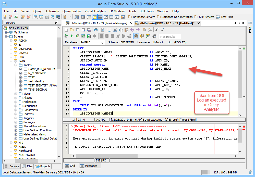 Using the same build of ADS I am able to see the session manager session when connecting to DB2 9.7 without exceptions in the SQL Log.