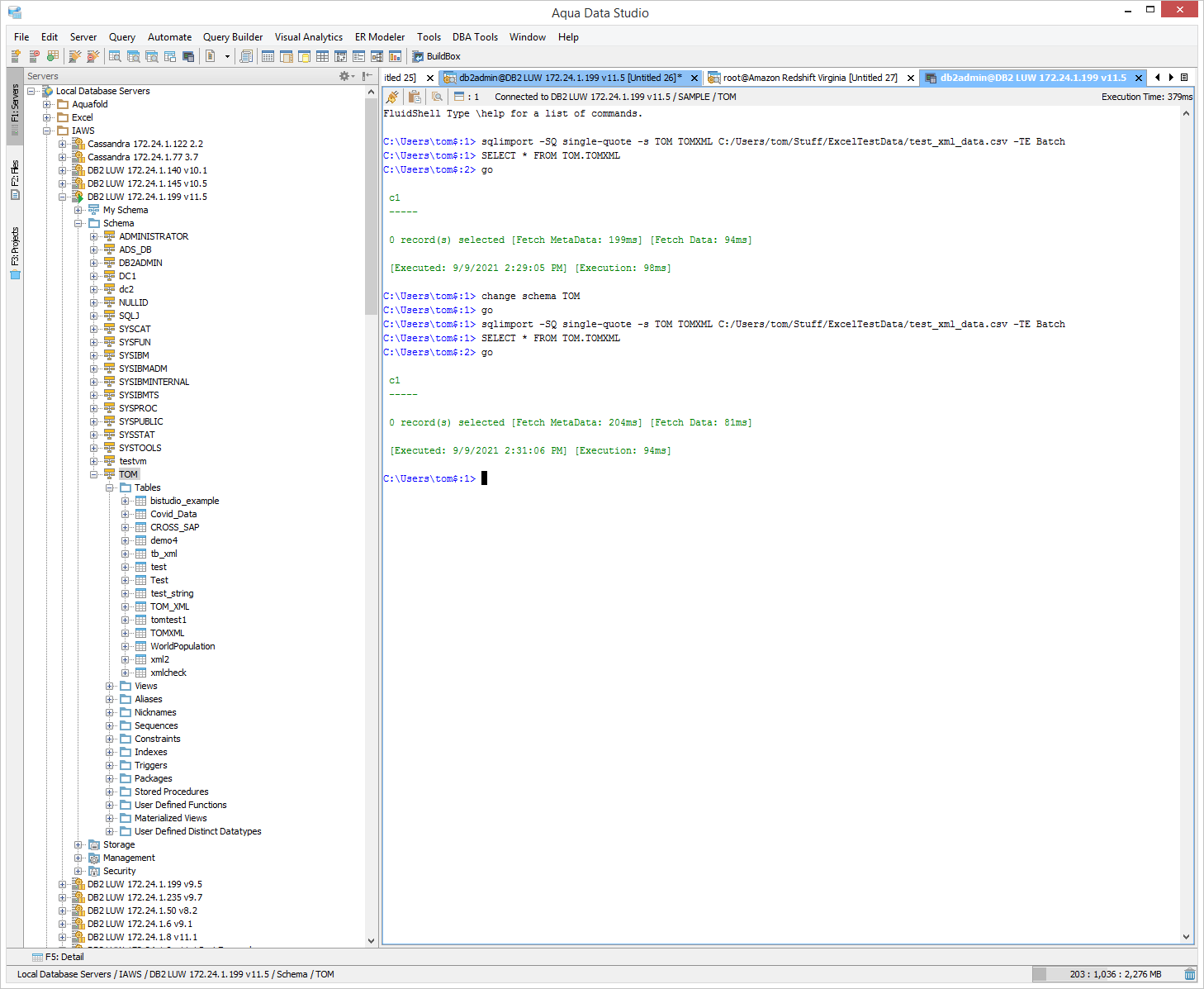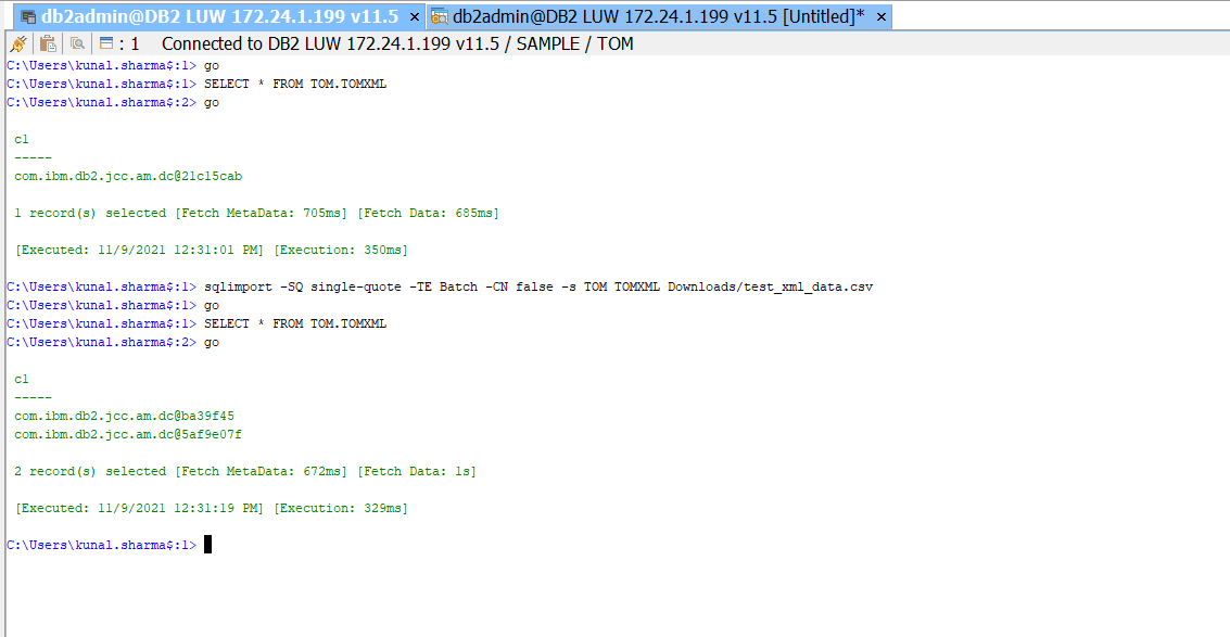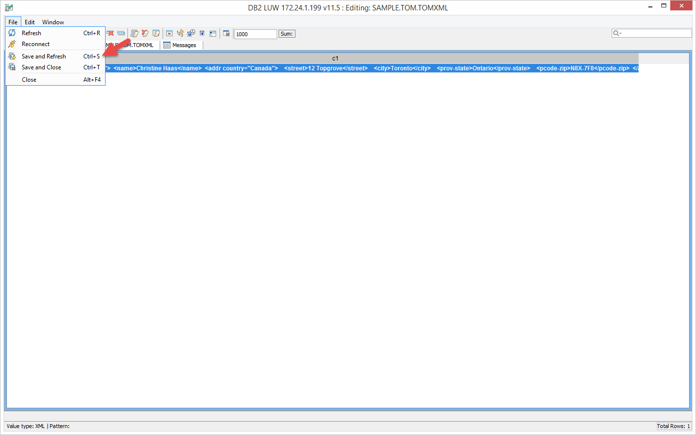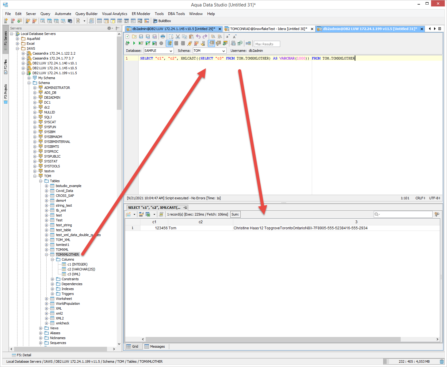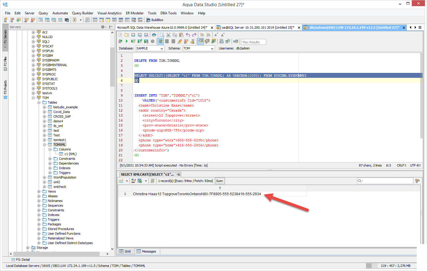 DELETE FROM TOM.TOMXML GO SELECT XMLCAST((SELECT "c1" FROM TOM.TOMXML) AS VARCHAR(1000)) FROM SYSIBM.SYSDUMMY1 GO INSERT INTO "TOM"."TOMXML"("c1") VALUES('<customerinfo Cid="1015"> <name>Christine Haas</name> <addr country="Canada"> <street>12 Topgrove</street> <city>Toronto</city> <prov-state>Ontario</prov-state> <pcode-zip>N8X-7F8</pcode-zip> </addr> <phone type="work">905-555-5238</phone> <phone type="home">416-555-2934</phone> </customerinfo>') GO