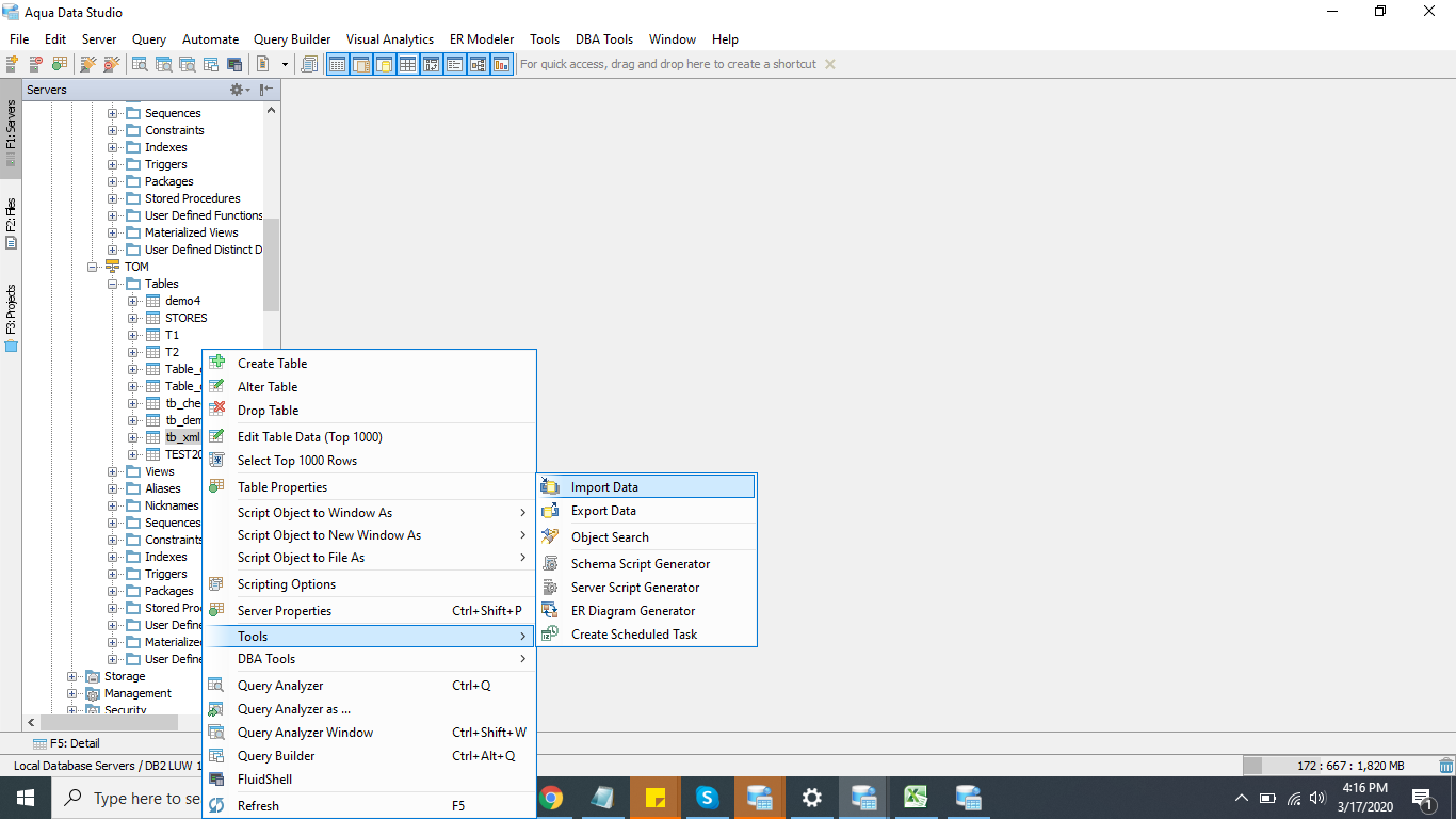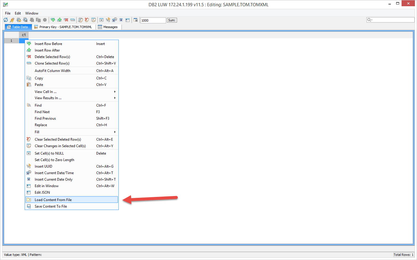 Juhi is correct that this works from the table data editor. I don't think her xml file will work so I attached a new xml file to test with - xmltest1.csv You have to use the new load from file option to import the xml and save to a table. The import should work in a similar manner. You will have to convert the XML to VARCHAR to confirm that the load worked. Here are some of the statements so you don't have to retype them. This is for DB2. Not sure about the other databases.
