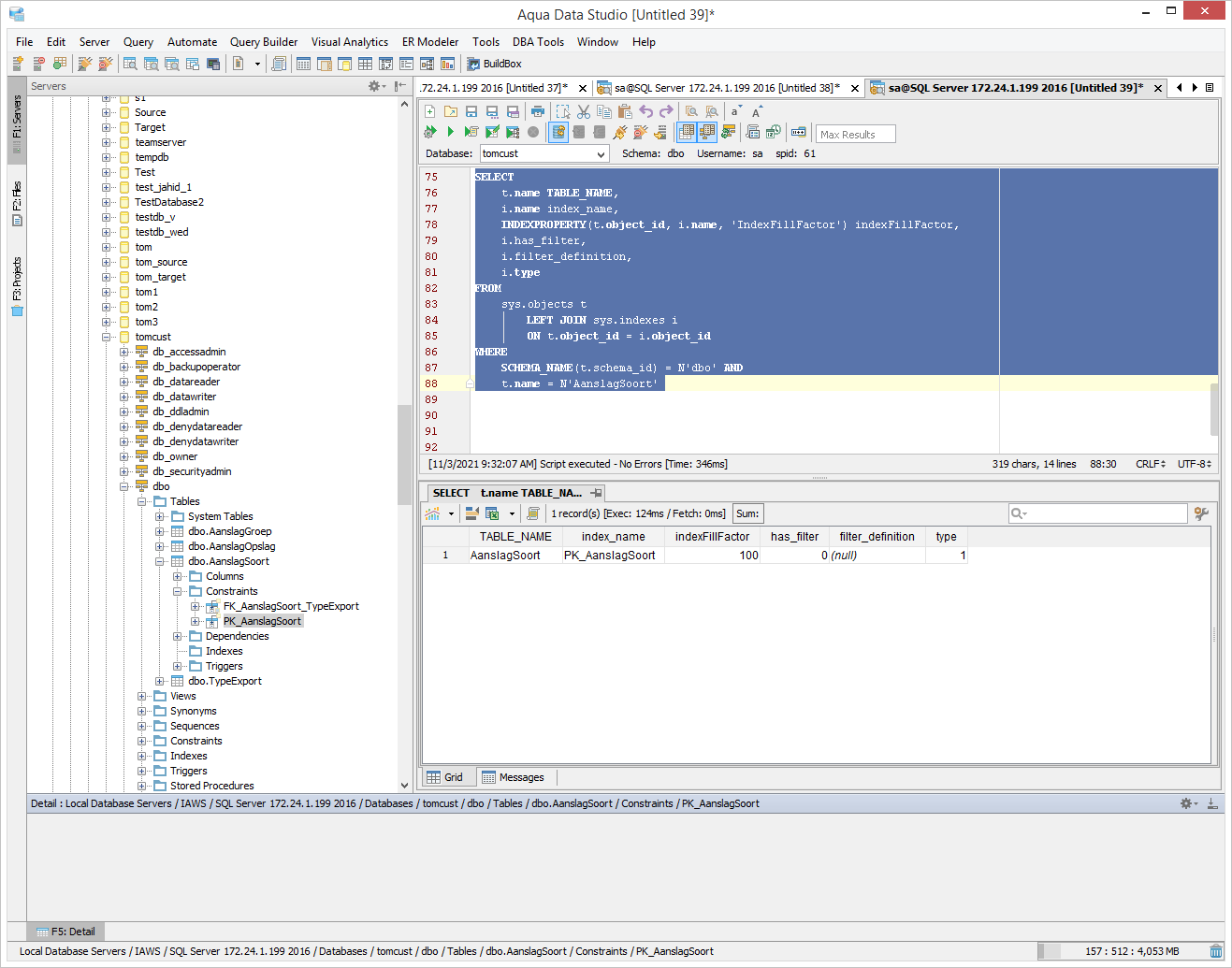 SELECT t.name TABLE_NAME, i.name index_name, INDEXPROPERTY(t.object_id, i.name, 'IndexFillFactor') indexFillFactor, i.has_filter, i.filter_definition, i.type FROM sys.objects t LEFT JOIN sys.indexes i ON t.object_id = i.object_id WHERE SCHEMA_NAME(t.schema_id) = N'dbo' AND t.name = N'AanslagSoort'