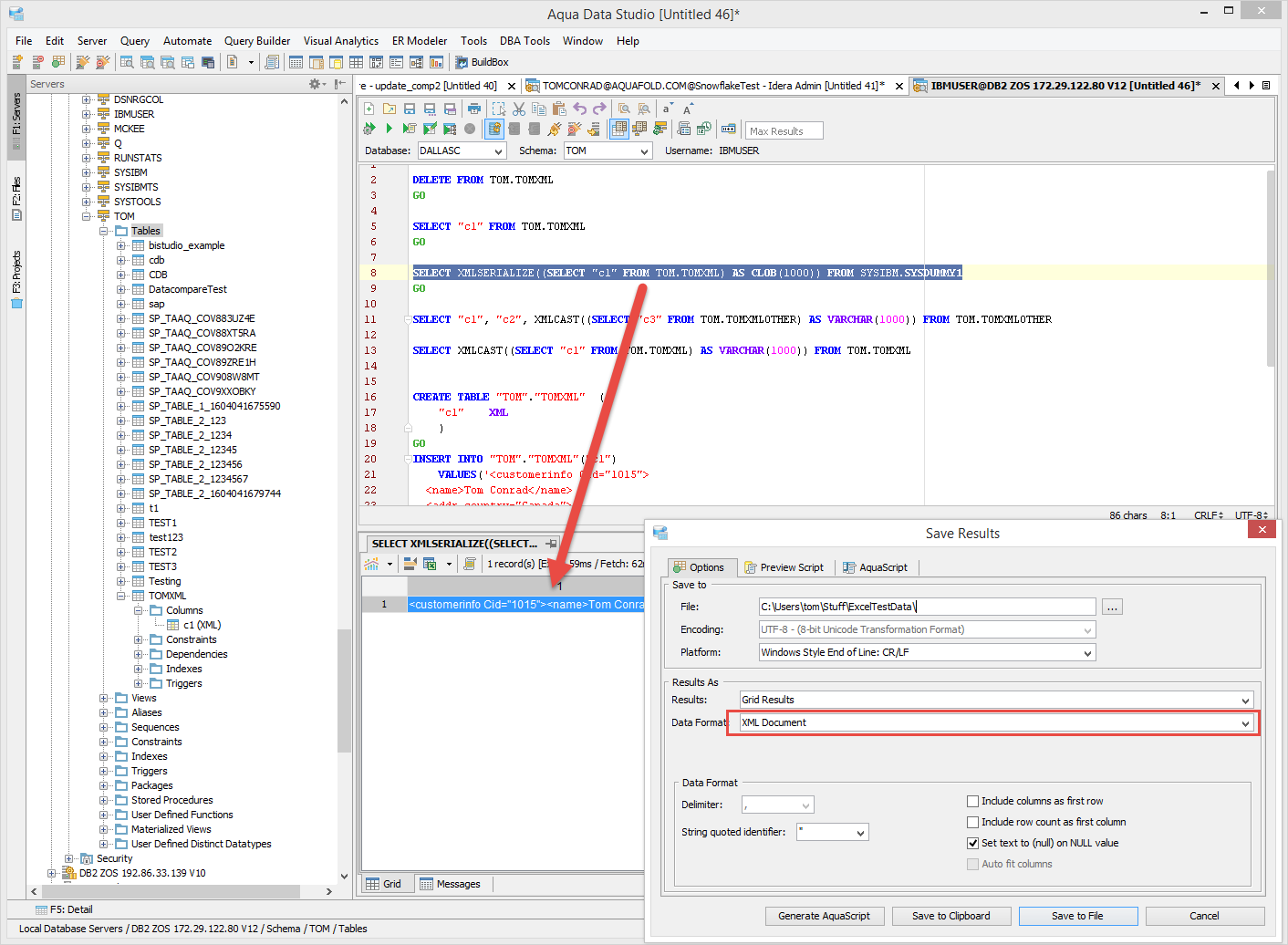In IBM Data Studio we used to see the XML column data from a select query and were able to open the XML data in a separate XML document. A user asks how to read XML column data on Aqua Studio. In Aqua Studio all XML data from the column are displayed as some JCC driver static text.