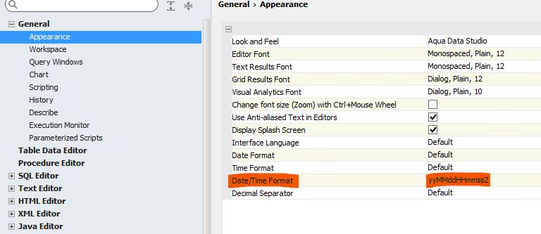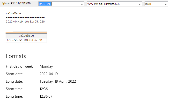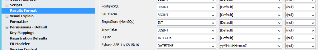 When I do execute on SELECT from table which has a datetime column (I am using SAP ASE 16.0 SP02), results are shown formatted according to my chosen format from settings (same for timestamp/time/date/datetime):