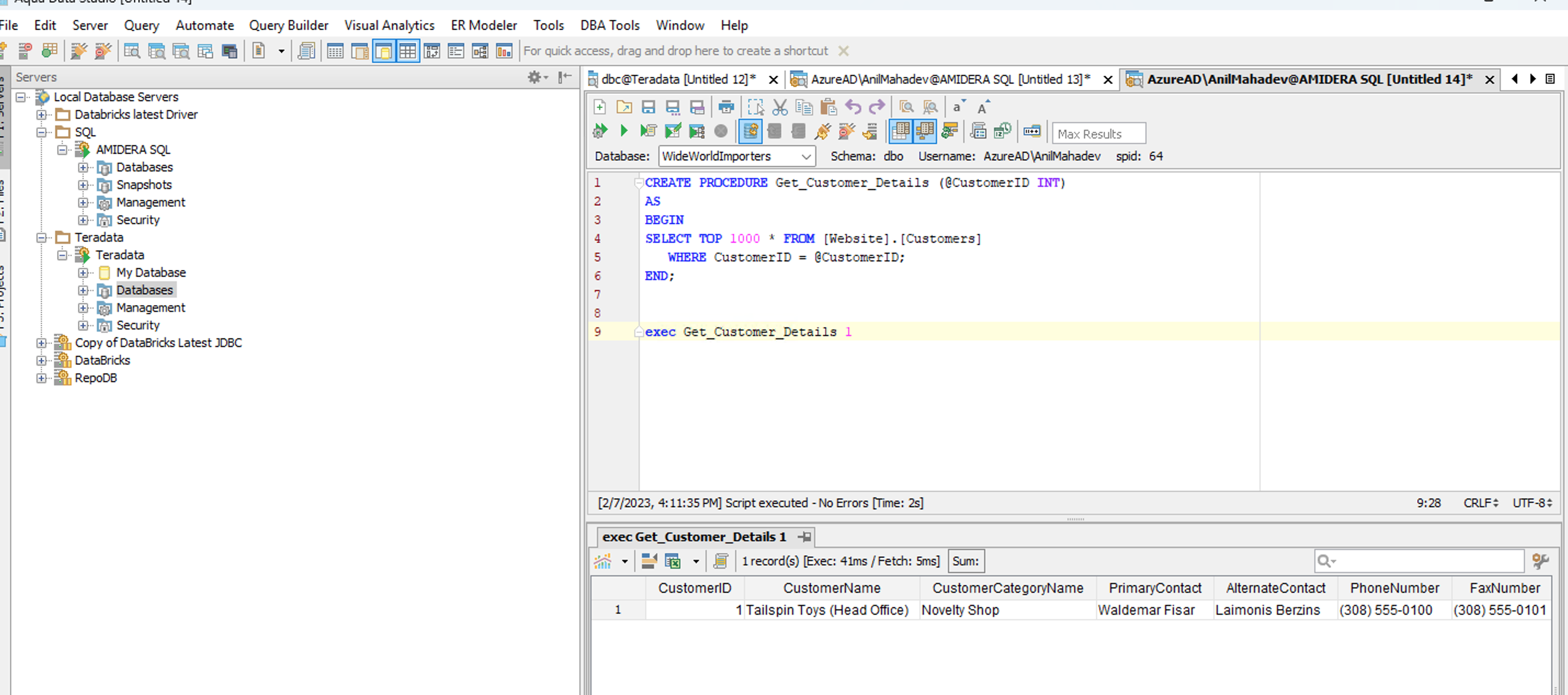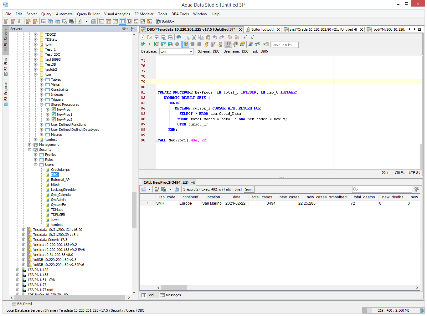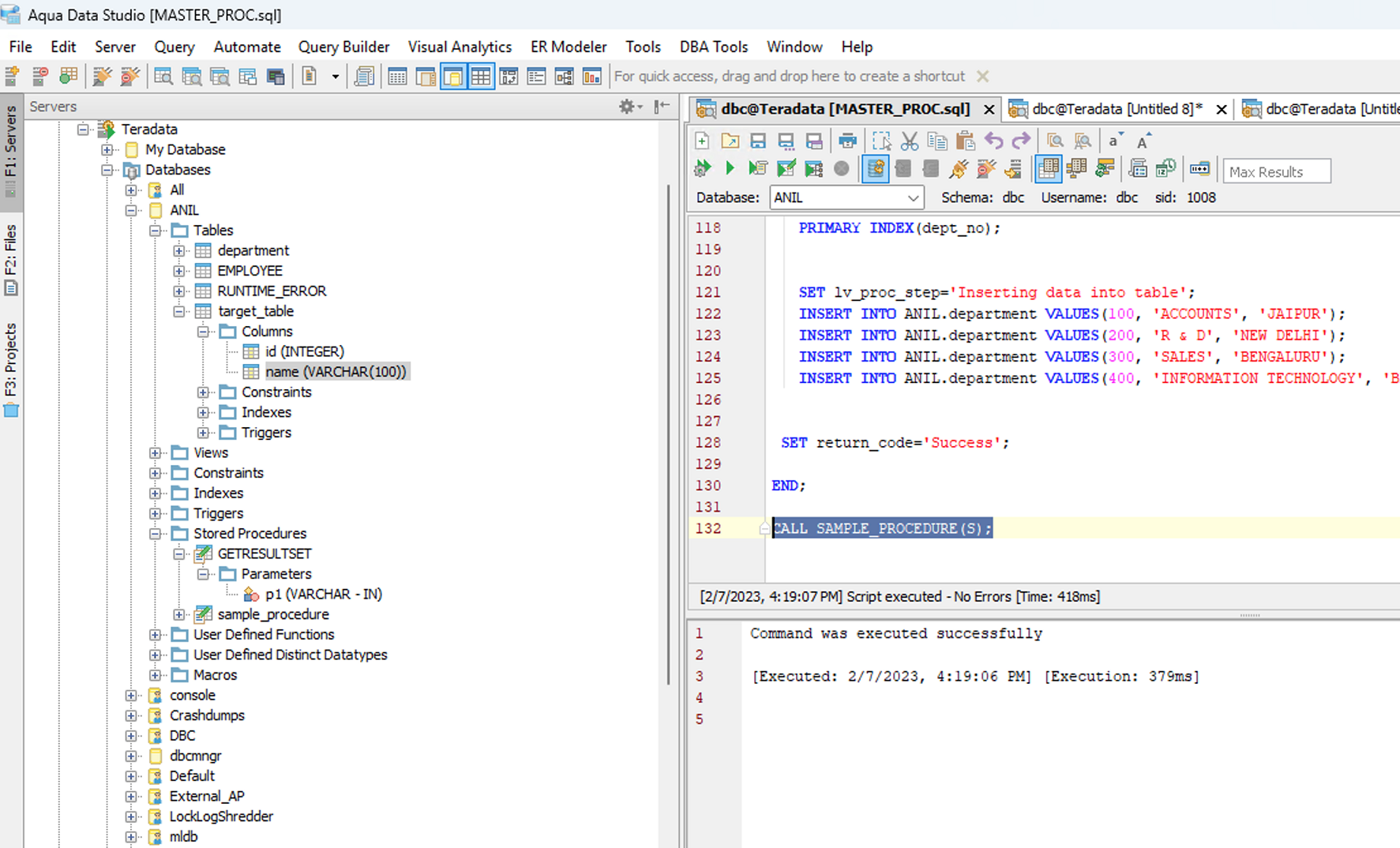When running a stored procedure, in Teradata, with an output, you only receive a message in the grid that the SP executed (see screenshot). Expected behavior would be a display of the output in the grid, such as shown in the SQL Server screenshot.